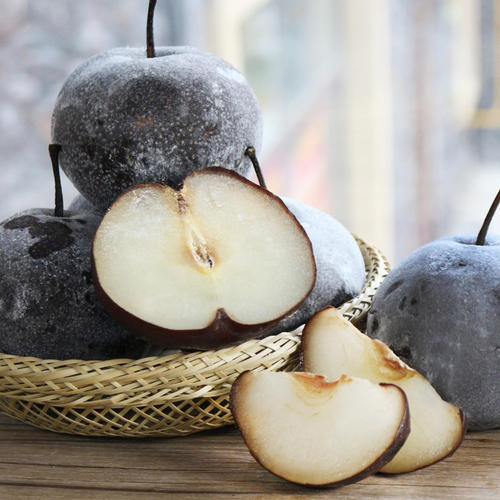 北方凍梨是寒冬贈(zèng)與的甜品。把新鮮的梨子隨手放在氣溫最低能達(dá)到零下三四十度的室外凍上一夜,經(jīng)過一夜的“雪打風(fēng)吹”裹著一層霜雪的凍梨就做好了。想吃凍梨的時(shí)候,把凍的像石頭一樣的梨子在室溫下用涼開水浸泡解凍半小時(shí),這時(shí)梨子的表面就會(huì)結(jié)出一層薄冰,掰開冰膜,一口咬下,整個(gè)口腔瞬間“透心涼,心飛揚(yáng)”,而這凍梨也是暖氣房里“潤燥”的佳品。